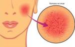 - Розацеа. Сначала появляется покраснение, а затем все лицо покрывается прыщиками.